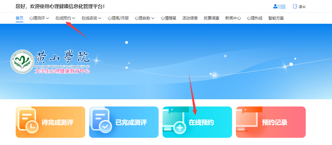 方法2:在“学生处”网站首页点击“心理健康”模块,进入“黄山学院心理健康教育中心”网站,点击页面左下角的“心理健康自助服务系统”。后续相同。